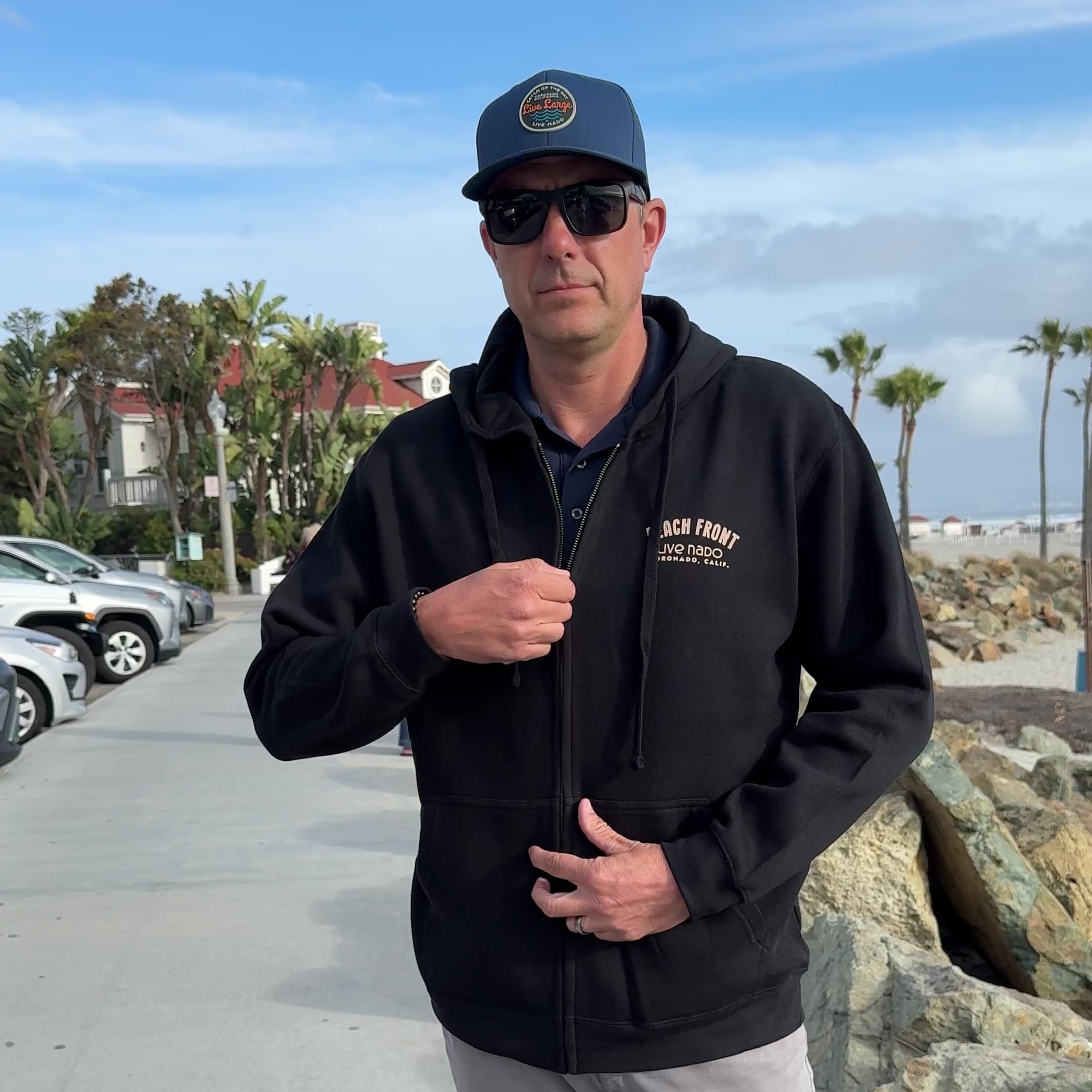 Stay cozy with coastal vibes in our Beach Front zip-up hoodie. This midweight fleece is perfect for layering on breezy beach days or cool nights around the fire pit. The back features a hand-drawn Coronado lifeguard chair listing all the local beaches—so you can carry a piece of the shoreline with you wherever you go.